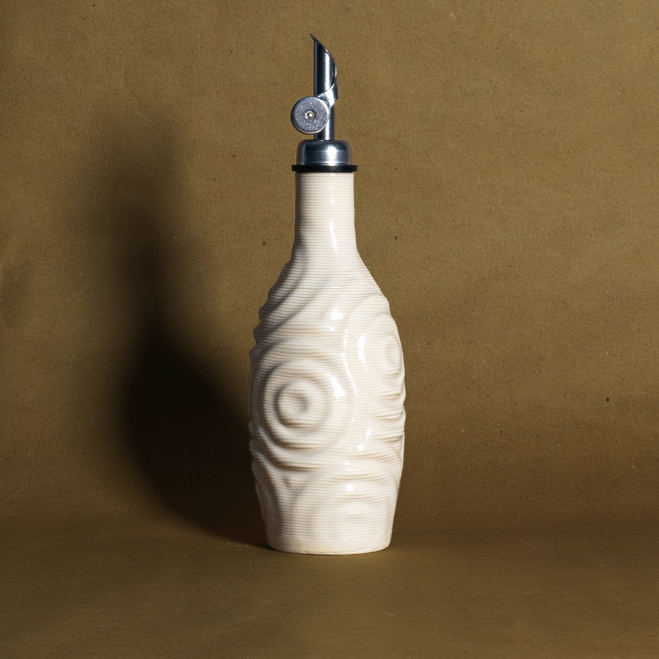 Mid-fired ceramic (Cone 6) with a food-safe, lead-free glaze. Finished with a stainless steel gravity-sealing spout for clean, controlled pours.