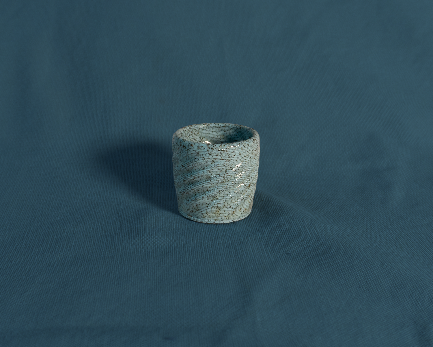 Crafted from a blue-speckled stoneware clay, this sake glass highlights the natural variation of the material through a simple clear glaze, allowing the subtle texture and color to shine. The spiral form offers a tactile grip and visual rhythm—elevating a functional object into a refined experience.